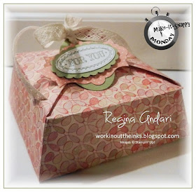 For today's MISM project, I chose this superdeeduper easy box. During my Monday-on-Sunday, I was making some cuts with the Silhouette and, since the area surrounding the machine was clear, I decided to cut this Cake Box. I've had the cut file for a while, but I hadn't tried it. The one-piece box kind of folds itself into the closure, which is comprised of two tab pieces with slits that slip over two circle tabs that meet the slit tabs in the center. I wish the camera and lighting had picked up on the shimmery glitter in the paper, but you'll just have to trust me that it is, indeed, shimmery. To create the tag, I used the following Stampin' Up! products: Apothecary Accents Framelits, Oval punches (Large, Scallop, and Wide), Pear Pizzazz and Crisp Cantaloupe ink, crochet trim, and Layered Labels stamp set.